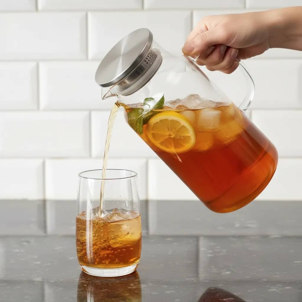 - Filtro integrado: La tapa de acero inoxidable incluye pequeños orificios que funcionan como colador. Es perfecta para servir aguas saborizadas con rodajas de limón, menta o hielo sin que nada caiga en el vaso.