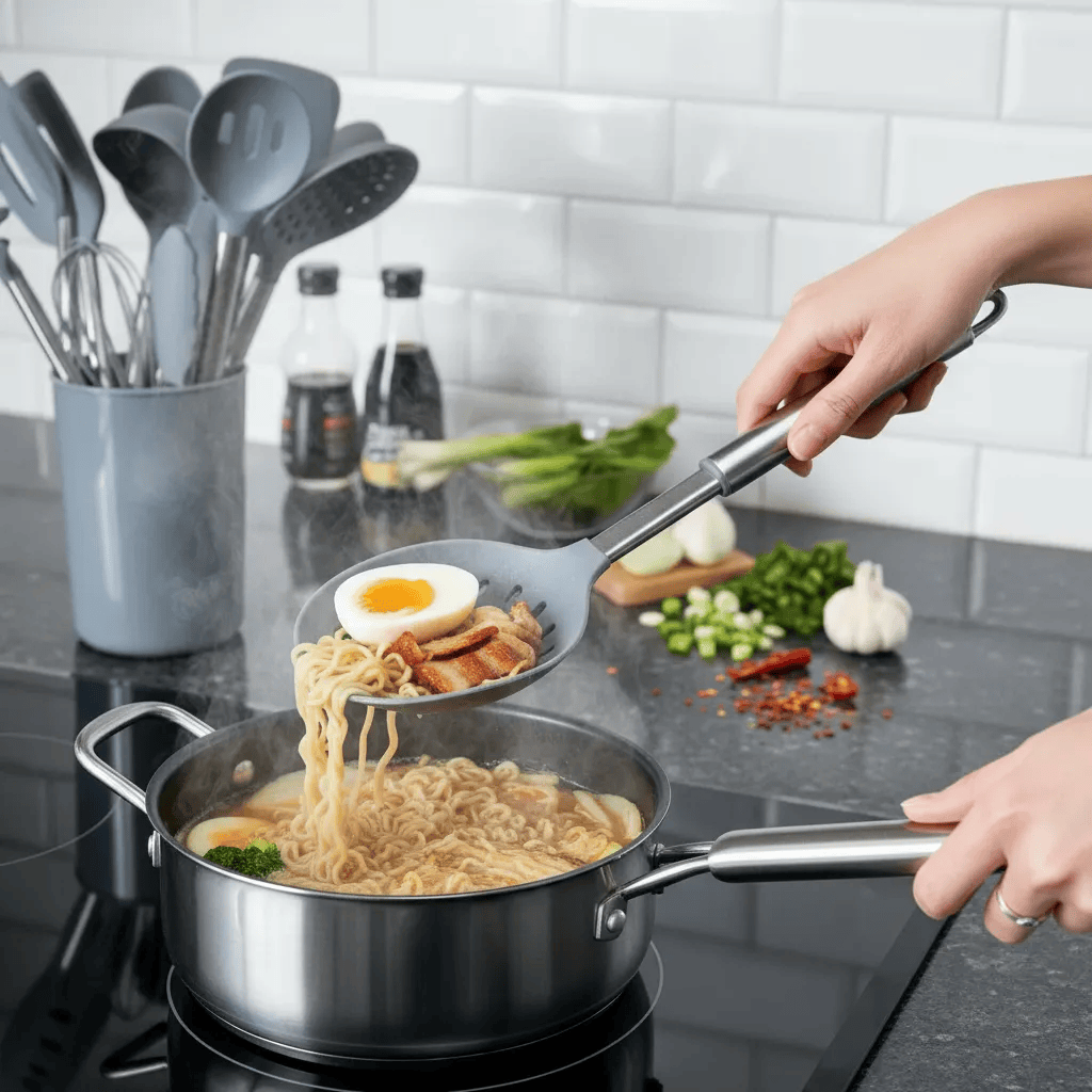 • Resistentes y firmes: Al tener el mango de acero, son mucho más firmes que los de plástico comunes; no se doblan cuando estás revolviendo algo pesado.