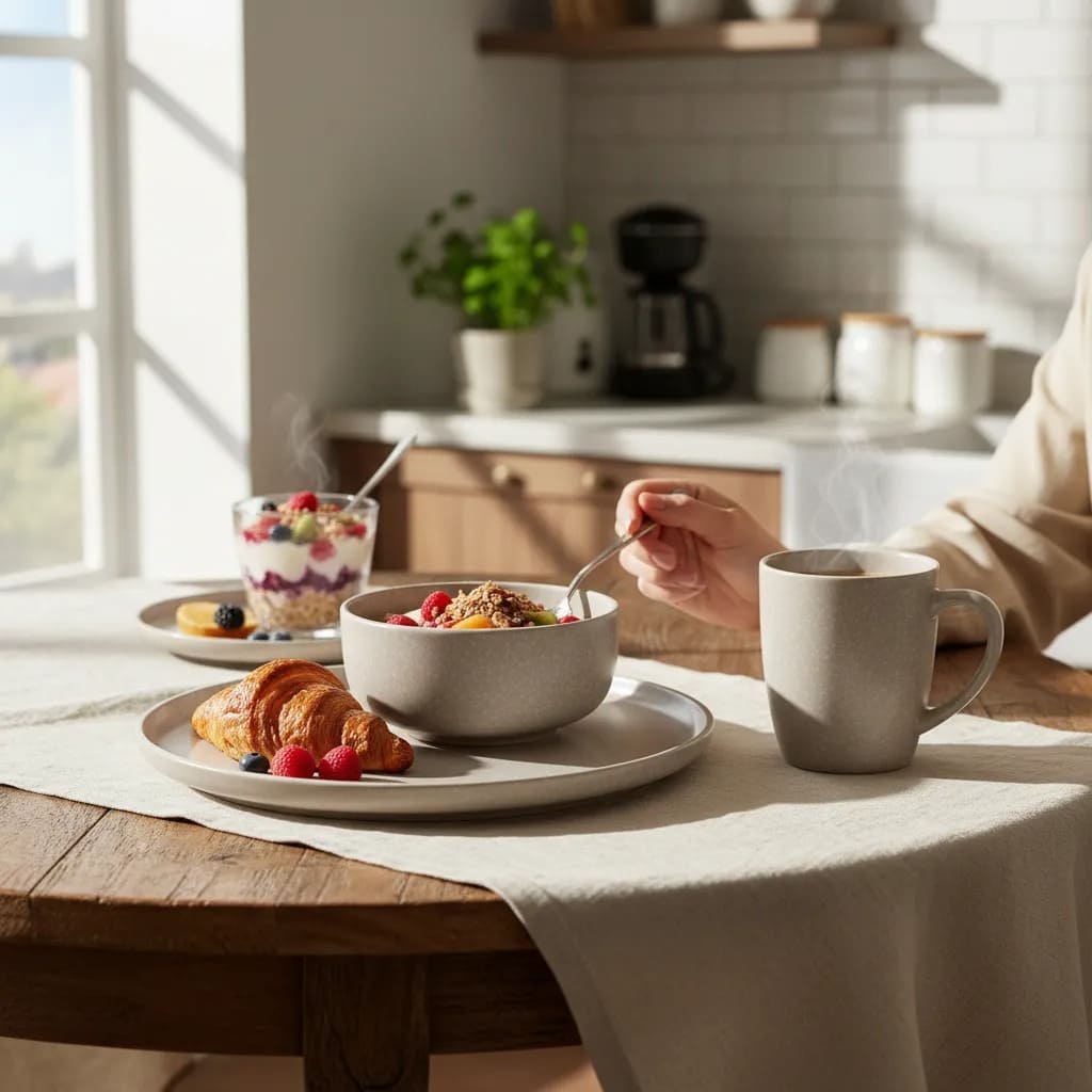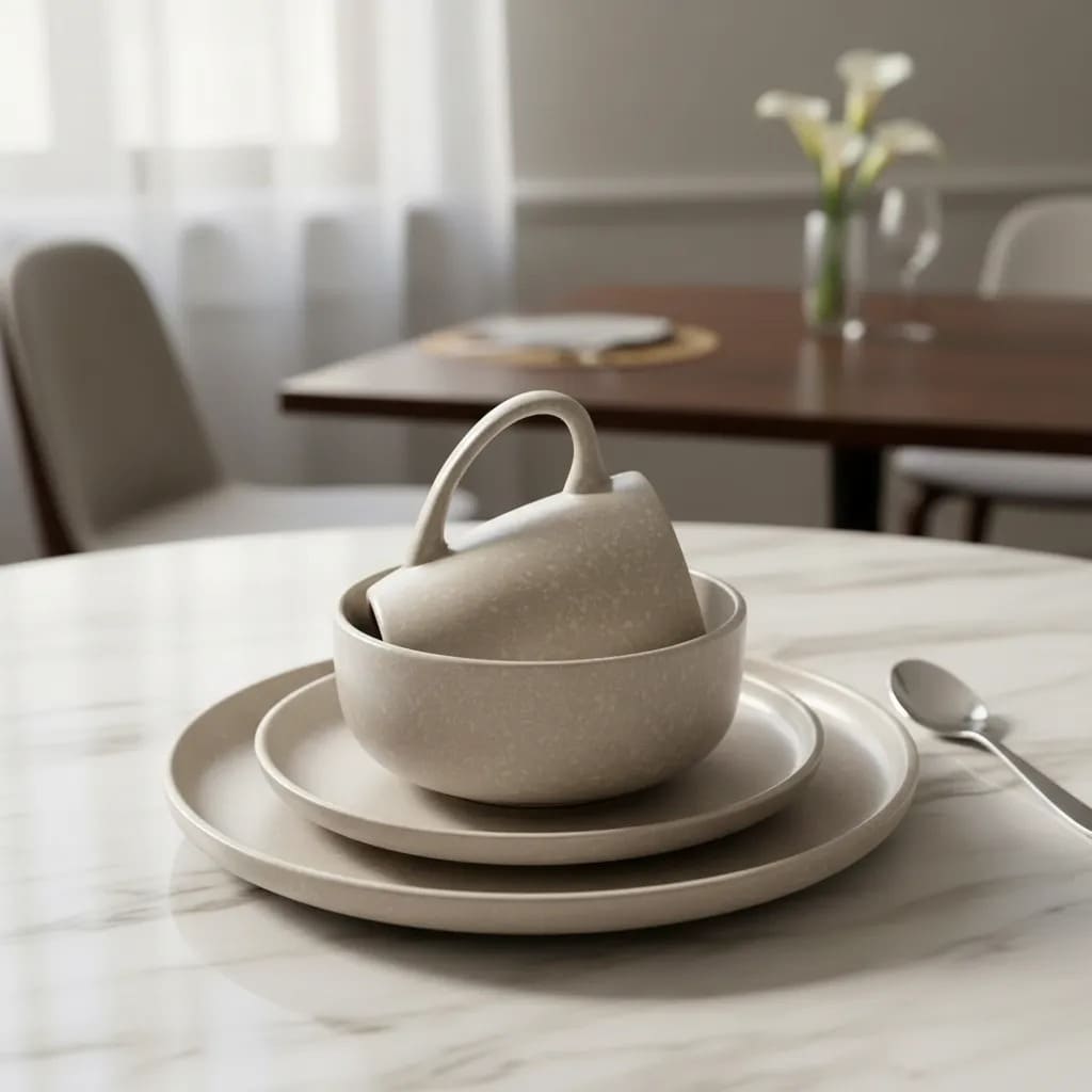 Si sos fan del estilo nórdico o natural, este juego de vajilla te va a encantar. El acabado en beige con sutiles motas blancas le da un aspecto orgánico y artesanal que hace que cada pieza se sienta única. Es la elección perfecta para quienes buscan una mesa que transmita calma y calidez.