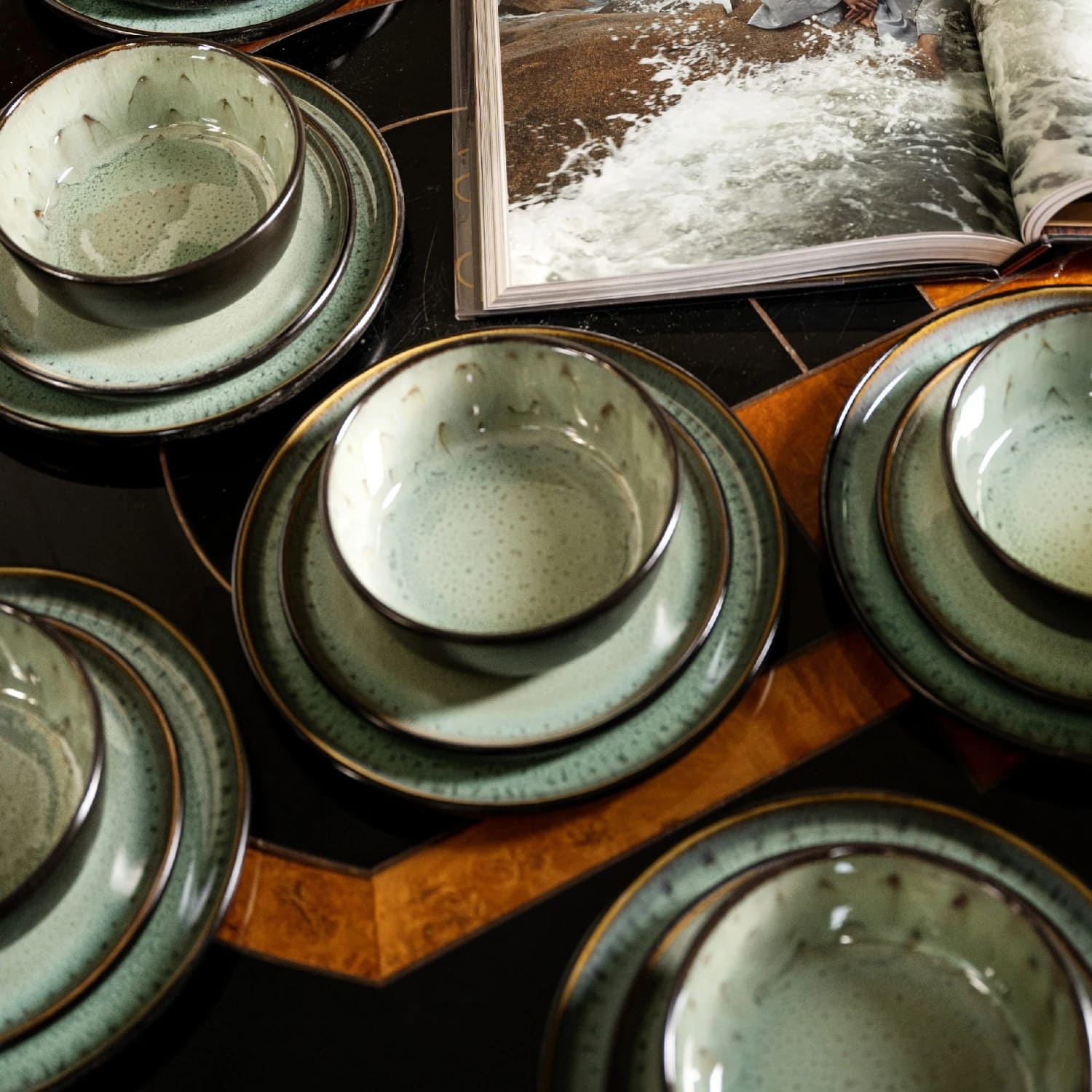 - Color y textura: El tono verde agua moteado aporta una frescura increíble. Al ser un esmaltado reactivo, las piezas tienen variaciones sutiles que las hacen sentir como objetos de autor.