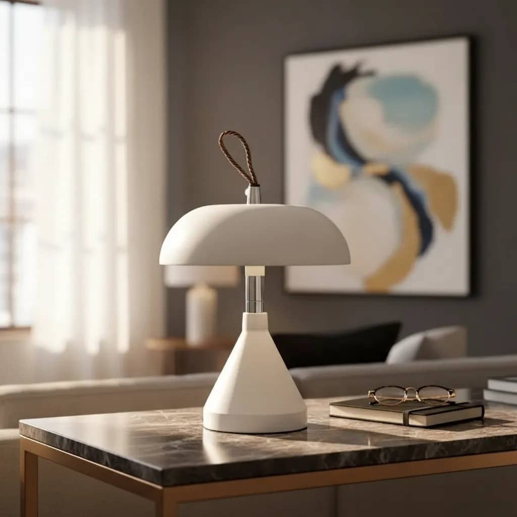 Una lámpara versátil que combina funcionalidad, movilidad y diseño llamativo.