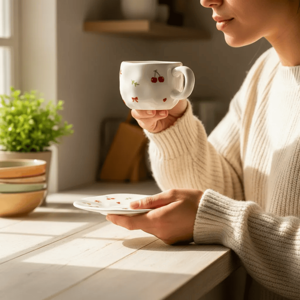 Disfrutá de tu té o café con esta encantadora taza de cerámica, acompañada de su plato a juego. Su diseño caporta un toque romántico y divertido, ideal para desayunos, meriendas o momentos especiales con tu bebida preferida.